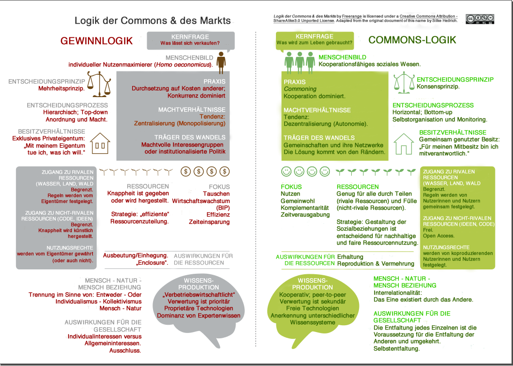 Commoning als Praxis bildet neben rein staatlichem oder privatwirtschaftlichem Handeln eine dritte Option der Verfügung über eine Ressource. Eine lokale Gemeinschaft kann alternative Infrastrukturen aufbauen, in denen Entscheidungen kollektiv und demokratisch getroffen werden und Ressourcen so genutzt werden, dass sie dem Wohl aller zugutekommen.